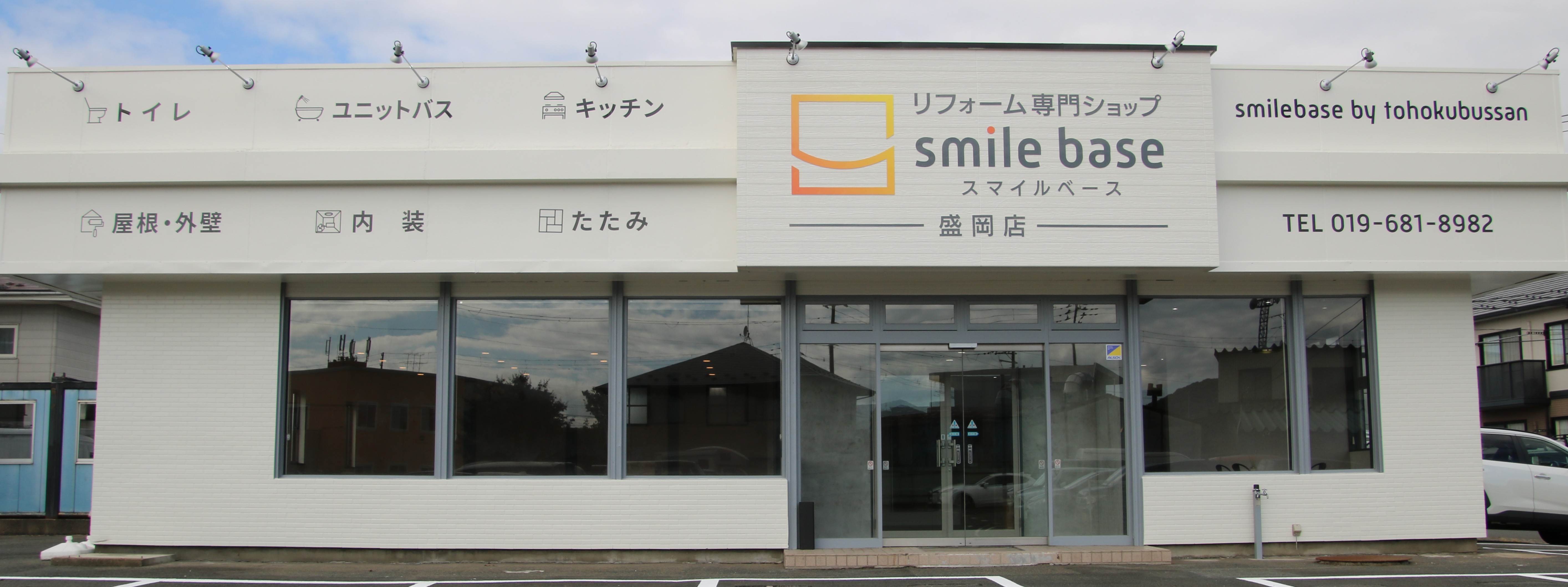 弊社が運営するリフォーム専門ショップ「smile base」が、盛岡市津志田にオープンいたします。おかげさまで創業60年を迎え、新たなチャレンジとして盛岡の地に一歩を踏み出します。経営理念「この街に沢山の笑顔を創る」を胸に、地元花巻で培った経験と想いをもとに、盛岡でも沢山の笑顔を創っていきます。今後ともどうぞ宜しくお願いいたします。